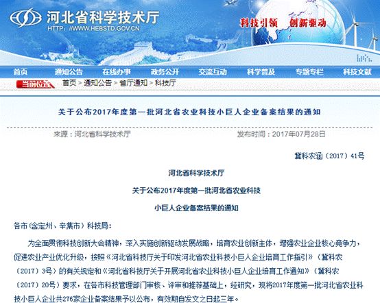 為培育農業(yè)創(chuàng )新主體、增強農業(yè)企業(yè)核心競爭力,日前,河北省科技廳公布2017年度首批河北省農業(yè)科技小巨人企業(yè)備案名單,包括石家莊中吉化肥有限公司在內的276家企業(yè)上榜。